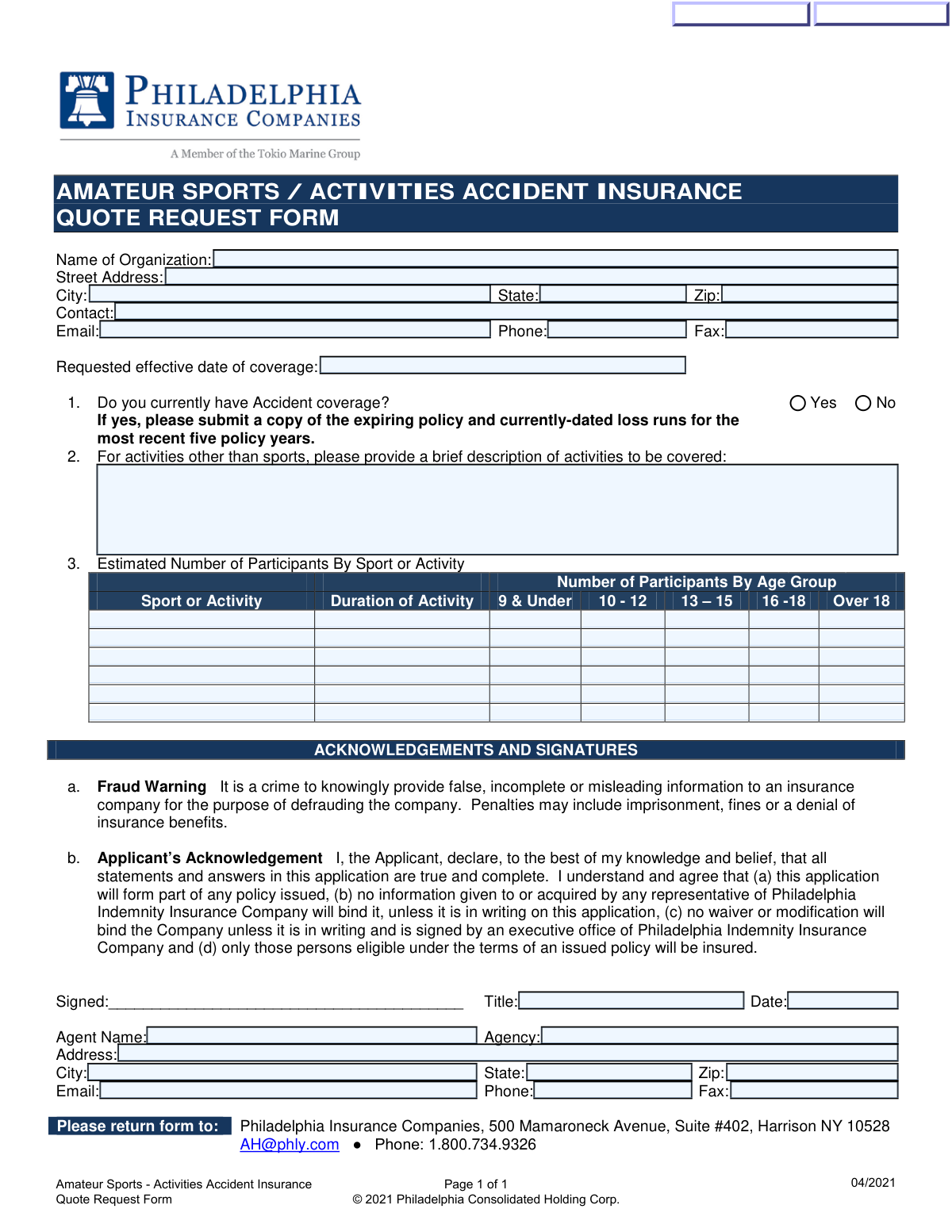 | Amateur Sports / Activities Accident Insurance Quote Request Form (Philadelphia Insurance Companies) | Gather organizational data to provide pricing for accident insurance coverage. | Amateur sports teams, leagues, and recreational activity organizations. | Participant counts, specific sports/activities, and current insurance coverage status. |