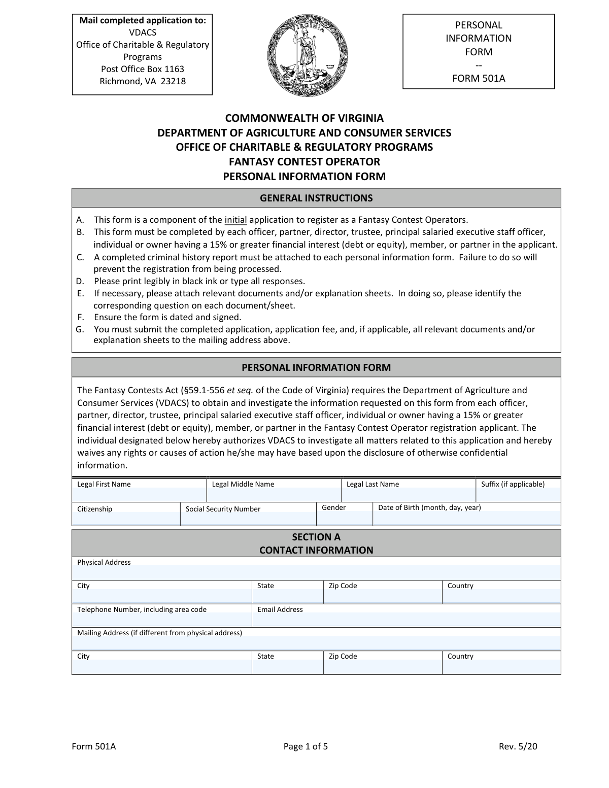 - Form 501A — Required if you're registering to operate a fantasy contest business in Virginia. Each officer, director, or major stakeholder (15%+ interest) must submit one individually.