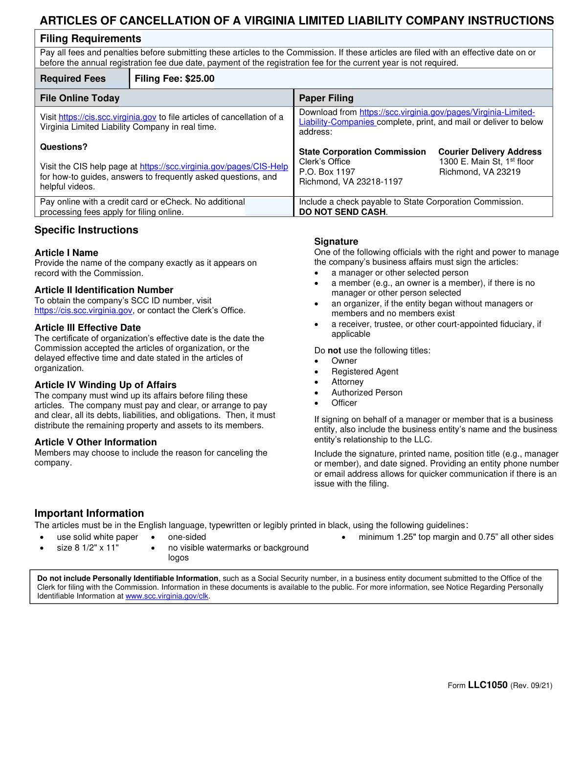 These forms are typically needed by business owners, attorneys, registered agents, and accountants who are managing the wind-down of a company. For example, a Virginia LLC that has settled its debts and distributed remaining assets would need to file Form LLC1050, Articles of Cancellation, with the Virginia State Corporation Commission to formally cancel the entity's existence under state law. The process involves confirming that winding-up procedures have been completed and providing key details about the entity.