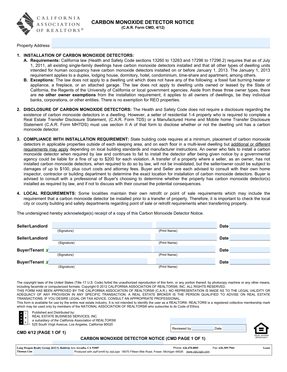 | Carbon Monoxide Detector Notice (C.A.R. Form CMD, 4/12) | Discloses state and local requirements for carbon monoxide detector installations in residential properties. | Residential dwellings, including single-family homes and multi-unit residential buildings. | Typically provided by the seller or landlord and acknowledged by the buyer or tenant. | Required during the sale or lease of residential real estate in California. |