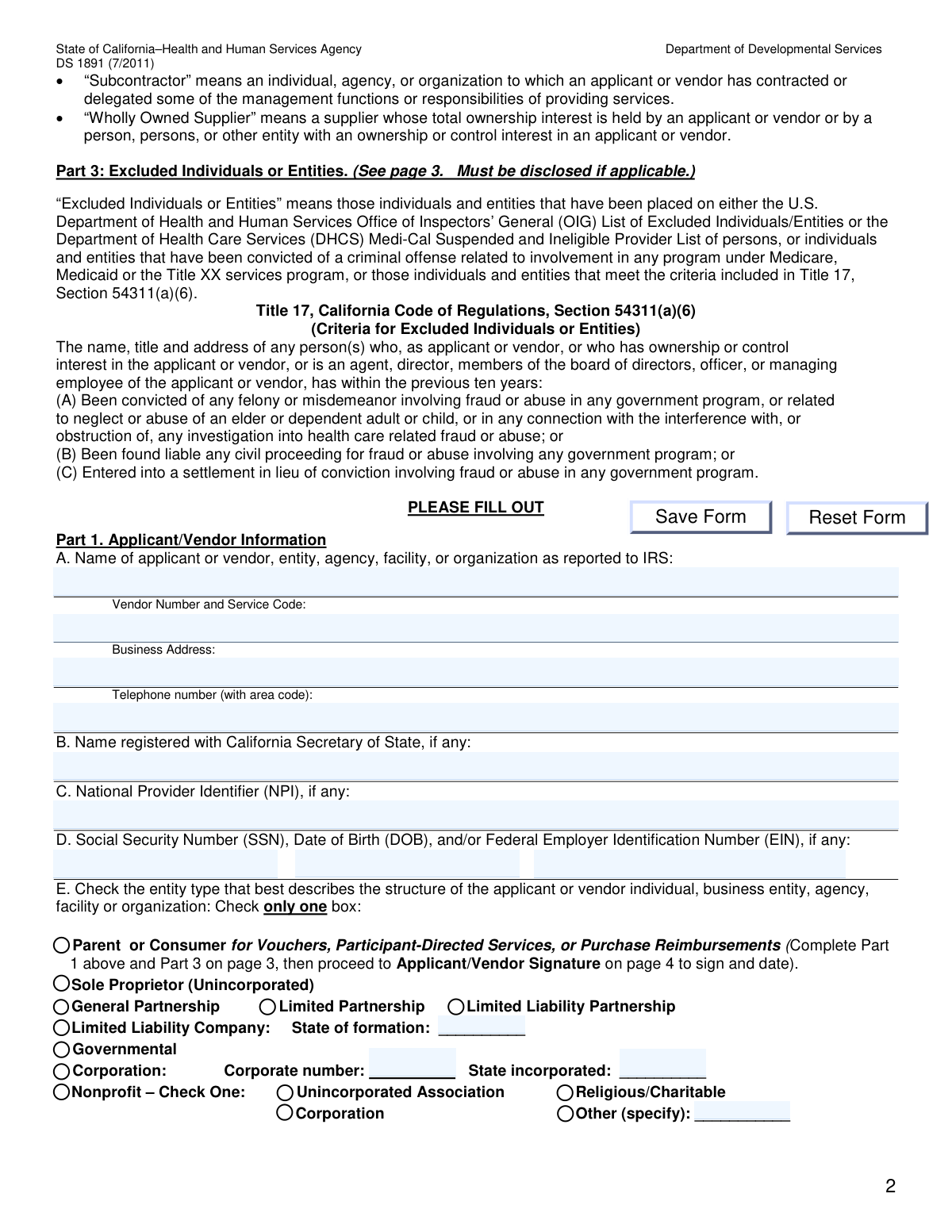 | DS 1891, Applicant/Vendor Disclosure Statement (State of California Department of Developmental Services) | Discloses ownership and compliance information for regional center vendor registration. | California Department of Developmental Services (DDS) | Applicants or vendors seeking to provide services to regional centers. |