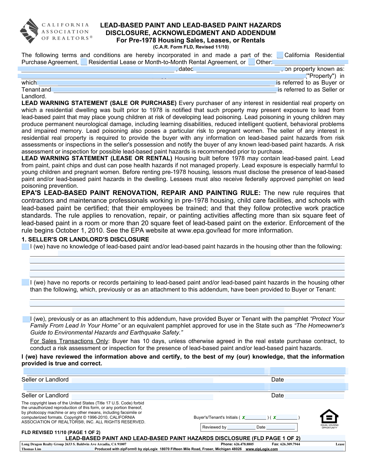 | C.A.R. Form FLD, Lead-Based Paint and Lead-Based Paint Hazards Disclosure, Acknowledgment and Addendum (Revised 11/10) | Discloses lead-based paint hazards and provides safety pamphlets to buyers. | California Real Estate | Selling or leasing residential property built before 1978. |
