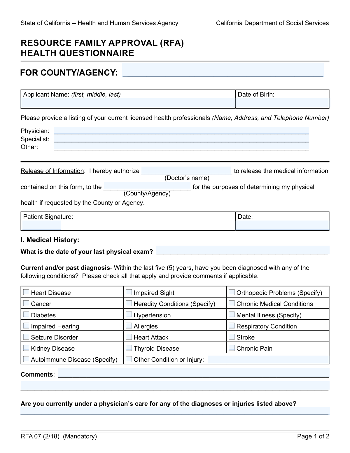 People who typically need foster care forms include prospective foster parents, relative caregivers, and non-related extended family members going through the Resource Family Approval (RFA) process. A key example is Form RFA 07, a mandatory health questionnaire that asks applicants to document their medical history, current providers, medications, and other health-related information — all of which help agencies assess a caregiver's readiness for the responsibilities involved. Incomplete or inaccurate responses can delay approval, so careful attention to detail matters.