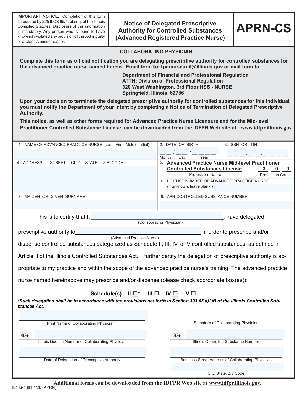 Illinois nursing forms cover a range of regulatory and licensing documents required by the state for nurses and advanced practice nurses (APNs) to legally practice, prescribe, and delegate clinical responsibilities. These forms are essential for maintaining compliance with Illinois Department of Financial and Professional Regulation (IDFPR) requirements and for clearly defining the scope of practice between healthcare providers. One key example in this category is the Advanced Practice Nurse Delegation of Prescriptive Authority for Controlled Substances, which formally documents the relationship between a collaborating physician and an APN, specifying which controlled substance schedules the nurse is authorized to prescribe or dispense.
