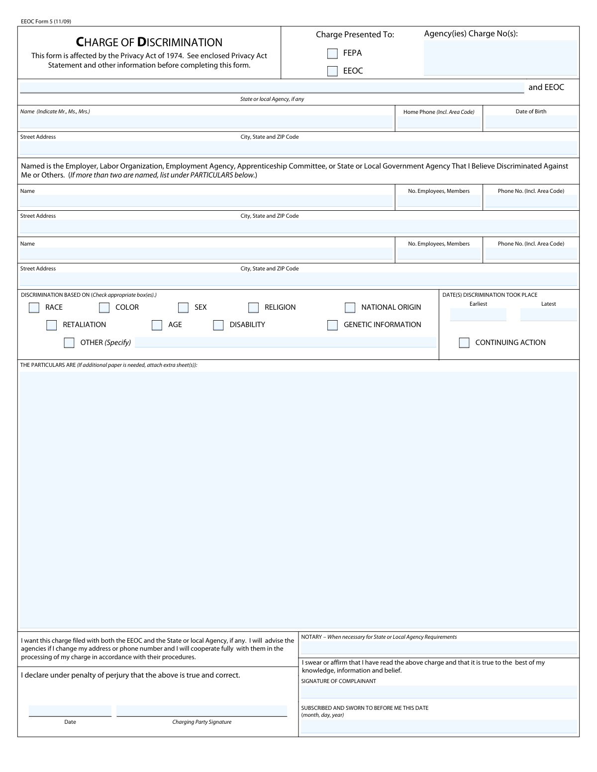 Anyone who believes they have experienced unlawful treatment in the workplace may need these forms. This includes employees, job applicants, and union members who face discrimination based on race, sex, age, disability, national origin, or other protected characteristics. A foundational example in this category is the EEOC Form 5, Charge of Discrimination — the document required to formally report employment discrimination to the Equal Employment Opportunity Commission. Filing this form correctly is often a legal prerequisite before bringing a private lawsuit under laws like Title VII, the ADA, or the ADEA, making it one of the most consequential forms a worker may ever complete.