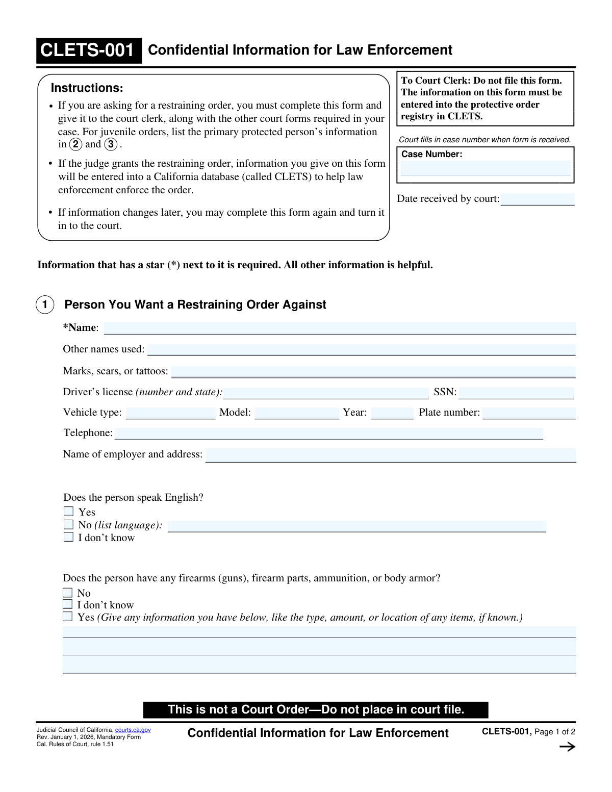 These forms are typically needed by a wide range of people — retiring or former law enforcement officers, domestic violence survivors seeking protective orders, attorneys handling restraining order cases, and members of the public who wish to formally report officer misconduct. Many of these forms, such as the CLETS-001 used in California courts, are submitted to government systems like the California Law Enforcement Telecommunications System and directly influence how orders are enforced in the field. Errors or omissions can affect outcomes significantly, making accuracy essential.