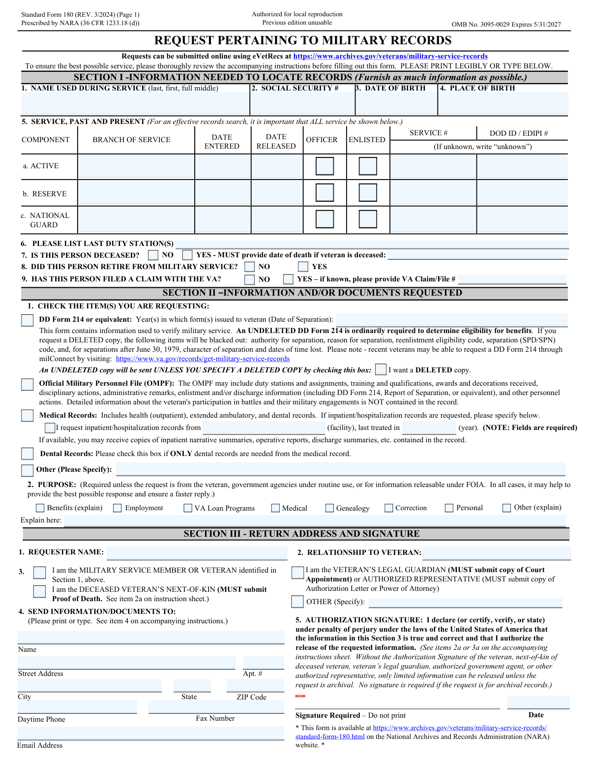| 1. | Standard Form 180 (SF 180), Request Pertaining to Military Records (REV. 3/2024) | 2 |