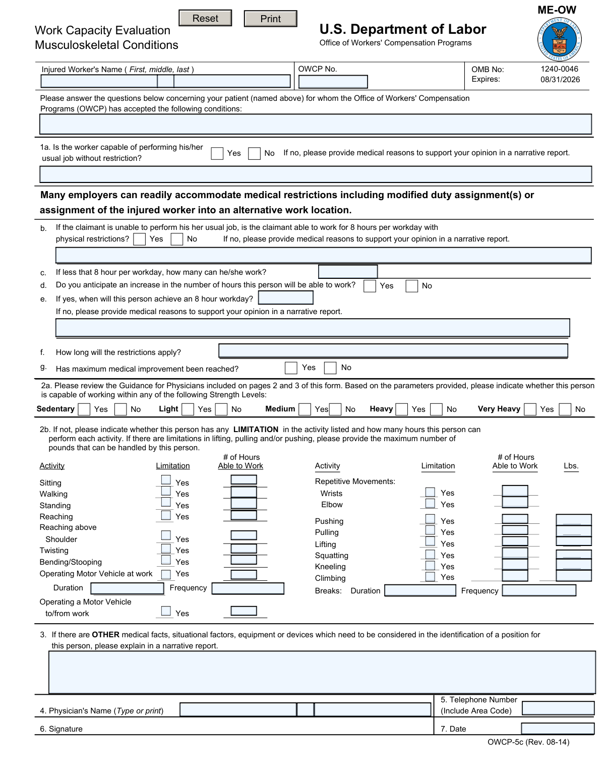 These forms are typically needed by injured federal employees, their treating physicians, and employing agency supervisors at various stages of a workers' compensation case. For example, a worker seeking reimbursement for out-of-pocket medical costs would file Form OWCP-915, while a physician evaluating a patient's ability to return to work after a musculoskeletal or psychiatric condition would complete one of the OWCP-5 series forms. Supervisors and healthcare providers often collaborate on forms like the CA-17 Duty Status Report to keep OWCP informed of an employee's current work limitations and case status.