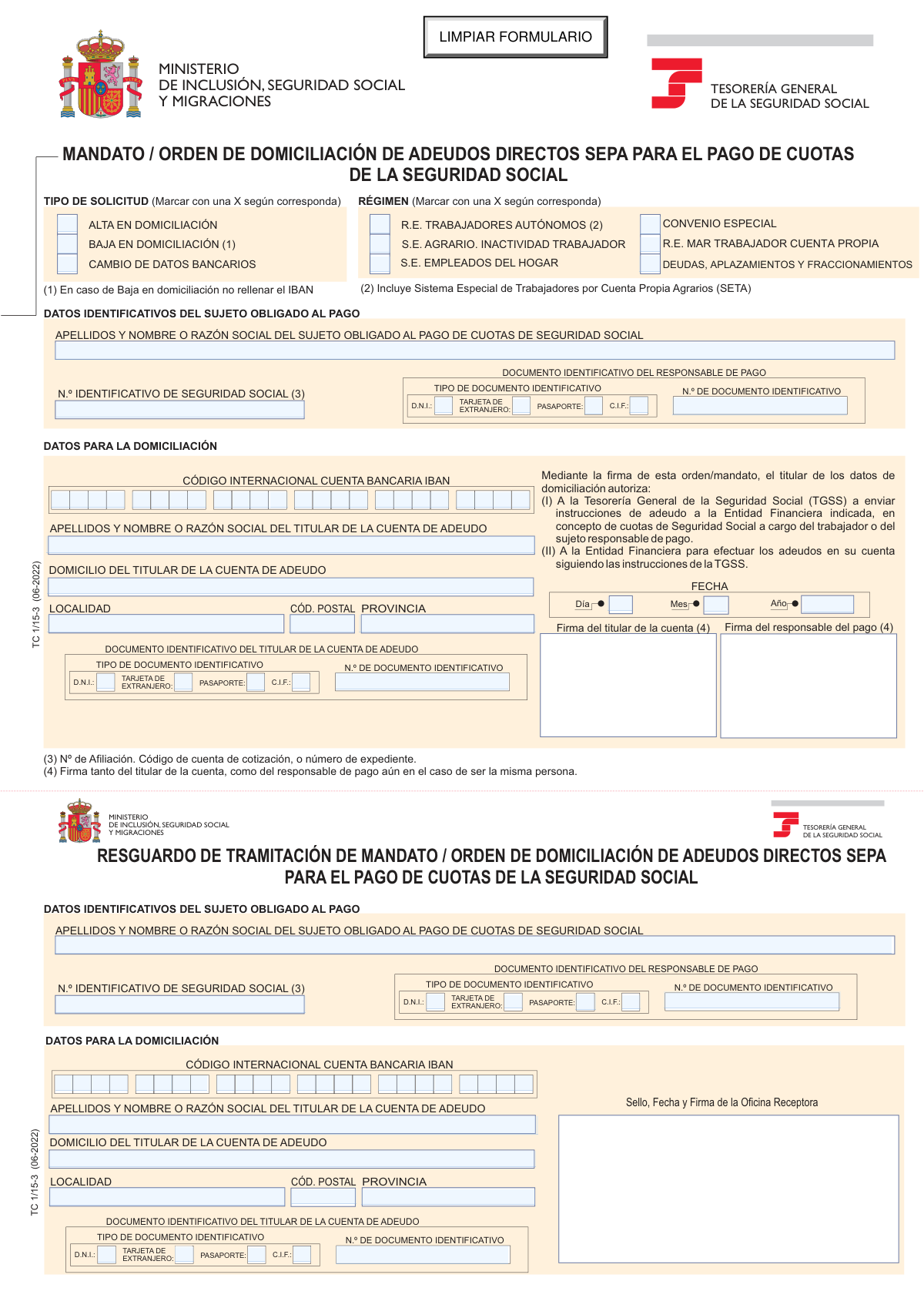 TGSS forms are official documents issued by the Tesorería General de la Seguridad Social, the Spanish agency responsible for managing Social Security contributions and payments. These forms cover a range of administrative procedures related to Social Security obligations, from registering as a contributor to authorizing direct debit payments. One of the most commonly needed documents in this category is the TC 1/15-3, the SEPA direct debit mandate that allows employers, self-employed workers, and other obligated parties to set up, modify, or cancel automatic bank payments for their Social Security contributions.